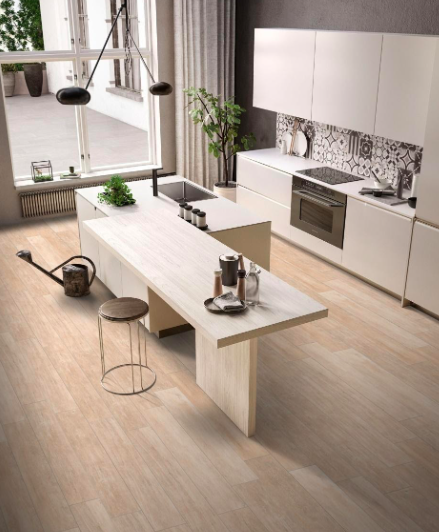 Không chỉ ốp gạch cho phần tường nhà bếp, sàn nhà bếp cũng sẽ rất tuyệt vời khi sử dụng gạch men vân gỗ. Tùy thuộc vào màu sắc đậm nhạt của các vật dụng nội thất được dùng trong không gian, ta có thể lựa chọn hoa văn và màu sắc cụ thể cho gạch lát nền Woodlook, làm thế nào để đem đến tổng hòa không gian hài hòa nhất.