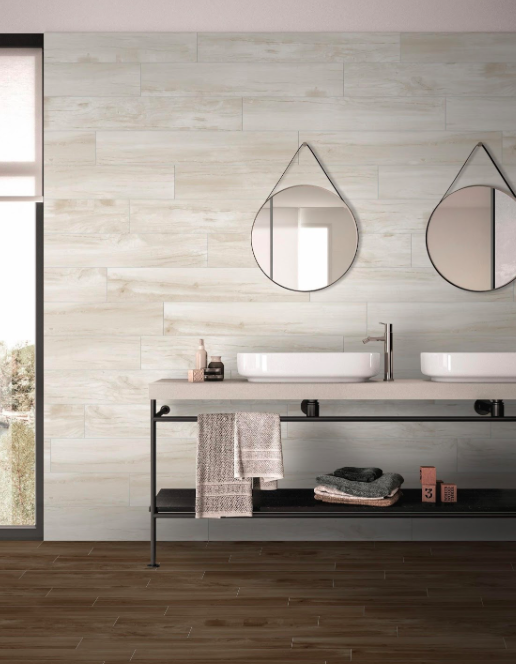 Đối với không gian đòi hỏi sự thư giãn và tinh tế như nhà tắm, gạch Woodlook nên được dùng theo ba sự lựa chọn:
