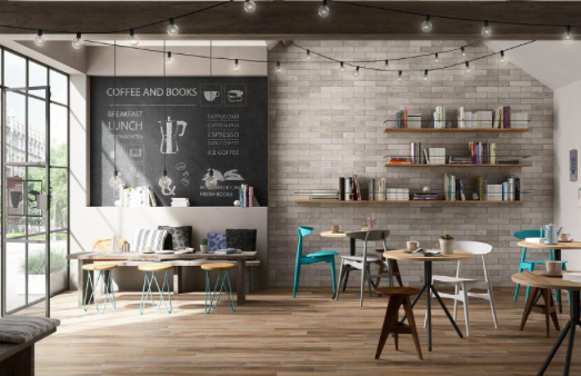 Đối với không gian của những quán café theo đuổi phong cách trang trí Tropical – Nhiệt đới và Rustic – Mộc mạc, giản đơn thì sử dụng gạch Woodlook để ốp lát sẽ là sự lựa chọn tuyệt vời nhất.